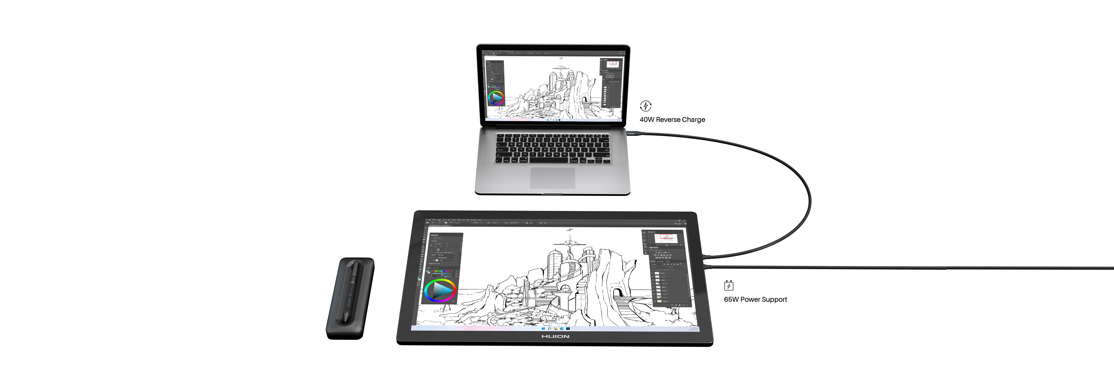 Blind-mate ports, reverse charging capability, a built-in stand, and VESA mount compatibility offer comprehensive artist-friendly working convenience.